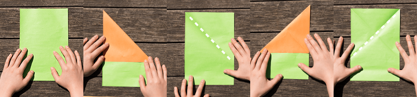 右上の角を左下に向かって折ろう。折って線の跡がついたら、一度開いて戻すよ。同じように左上の角を右下に向かって折り、こちらも開くよ。
